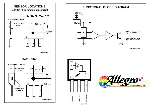 Por último, el conector tetrapolar con tres cables: dos sirven para alimentar al sensor (si se quiere, ya que puede llevarse desde la misma alimentación sin pasar por el tacómetro) y el cable marrón que queda es la entrada de señal desde el sensor al tacómetro. El sensor puede ser fotoeléctrico o de tipo Hall. Y dependiendo si el sensor es del tipo P o N, habrá que polarizar debidamente la entrada al tacómetro para que éste detecte cuándo el voltaje cambia de estado al activarse el sensor. En mi caso, he empleado un sensor de efecto Hall que cuando conduce cortocircuita a masa un potencial positivo que suministro mediante una resistencia de 100 k (desde el polo positivo de la fuente). Todo esto está muy liado, pero no encuentro ahora ninguna figura. A algún forero le envié algo hace un año y si él puede colocar la figura que falta, sería de agradecer. Sí inserto la figura de un sensor de efecto Hall, aunque podría colocarse en su lugar un fotodiodo que recibiera los pulsos por reflexión o por intercepción de un haz de luz: