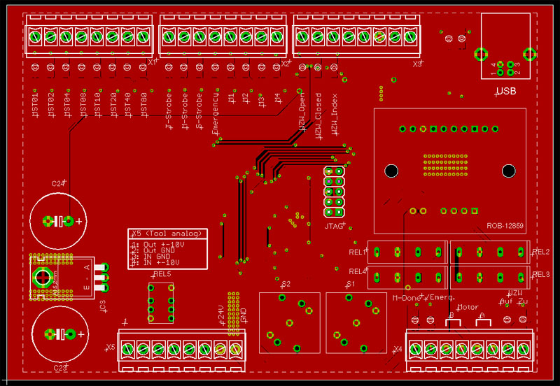 He puesto en cada entrada/salida un LED, ideal para debugging, tambíen 2 pulsadores para abrir/girar sin control númerico (en ejemplo para ajustar herramientas etc.)